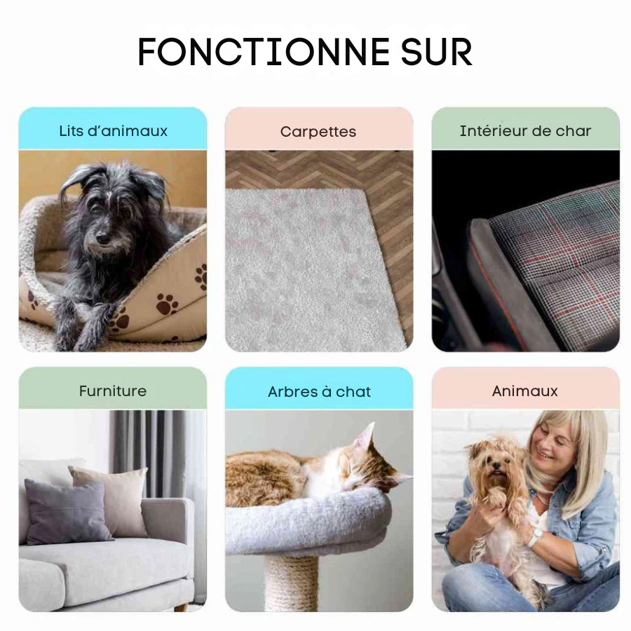 C’est incroyablement efficace pour enlever les poils collés sur le linge, les tapis, les divans pis les bancs d’auto.